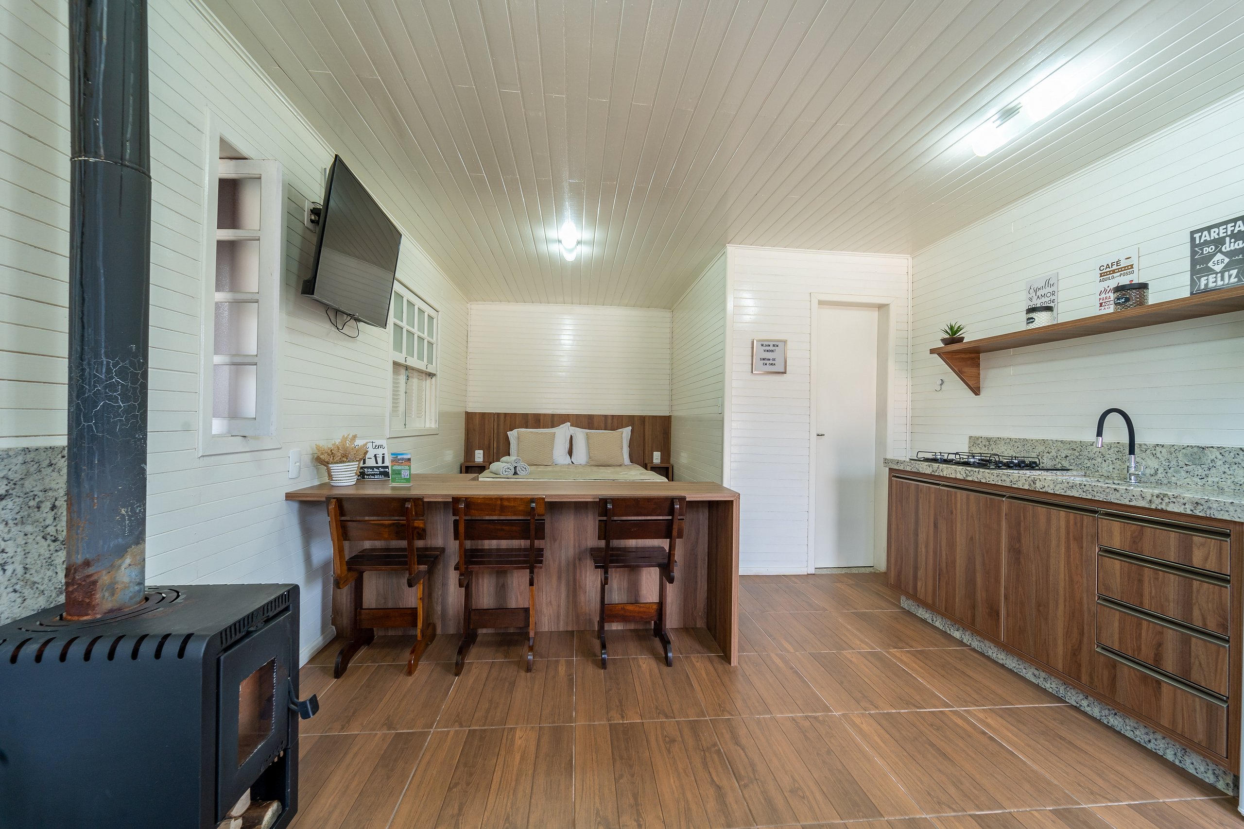 são 3 chalés iguais, que acomodam até 4 pessoas cada e são equipados com: